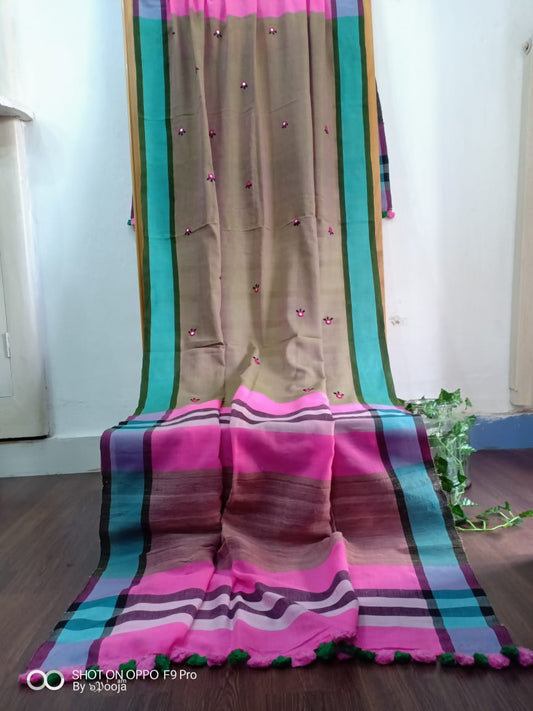 Orange embroidered handwoven cotton sari