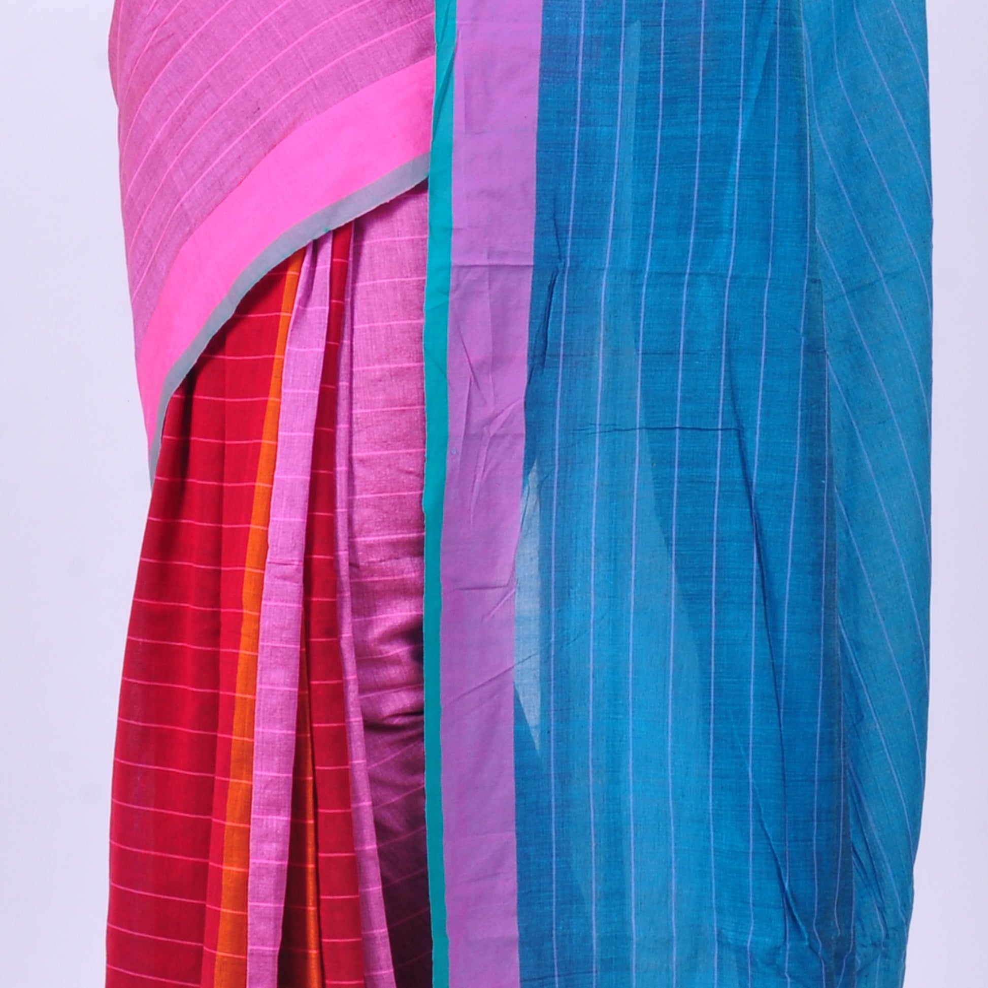 Multicoloured sari with pink and blue pallu. It comes with a mustard blouse piece.